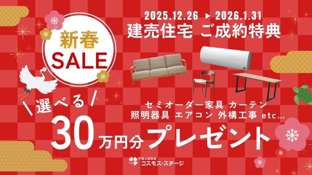 12月26日~1月31日までの期間中、ご成約様に新春お年玉特典として、30万円分のオプション費用を進呈いたします!
