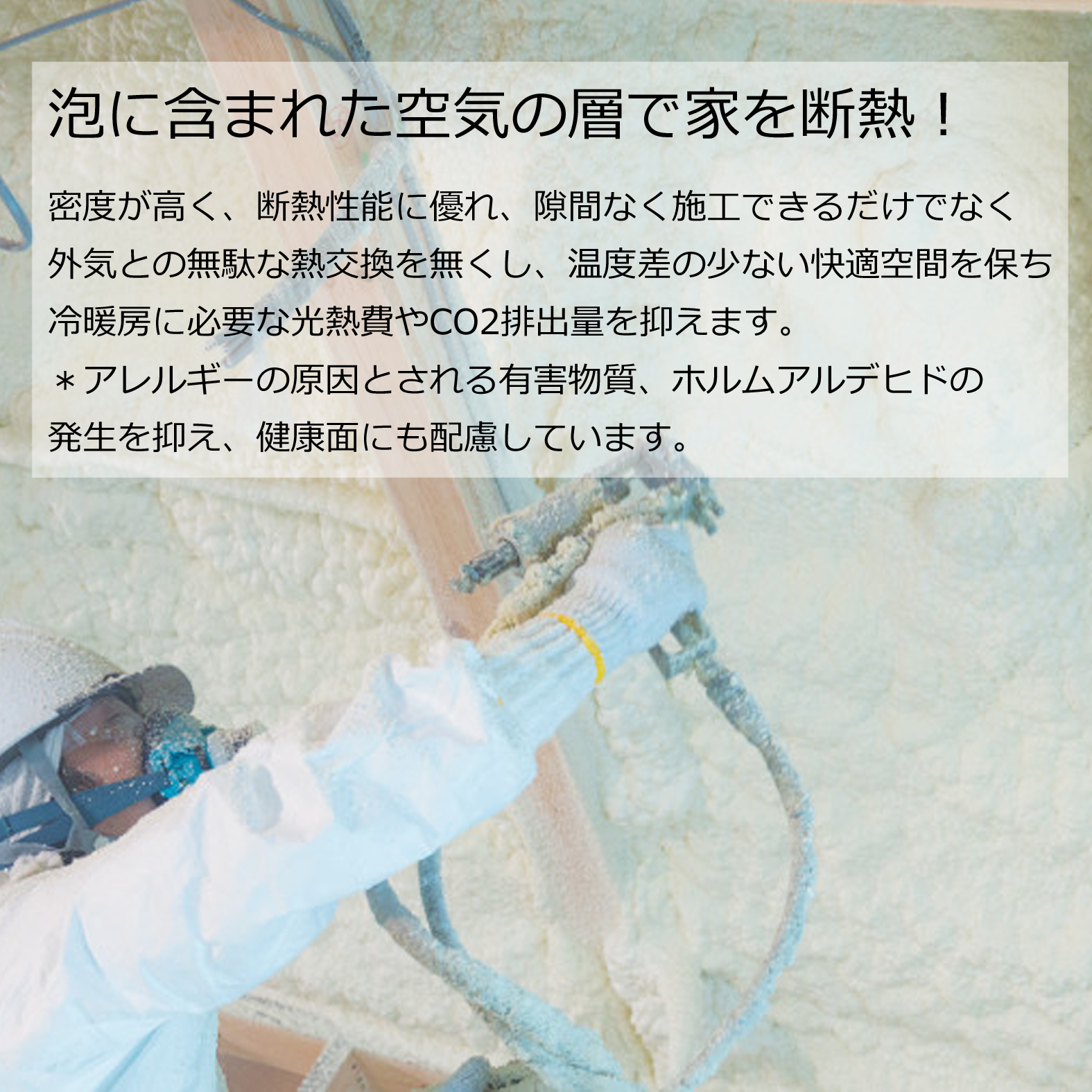 吹付けウレタンフォームを、壁95ミリ、屋根250ミリ、床は板状の断熱材100ミリでしっかり断熱します。