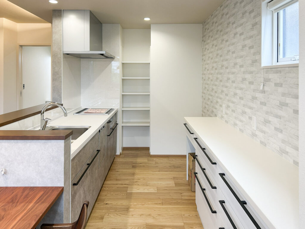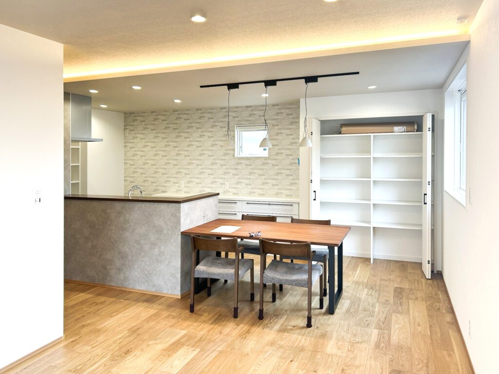 キッチン・ダイニングが横並びの配置です。配膳のしやすさから喜ばれています。
